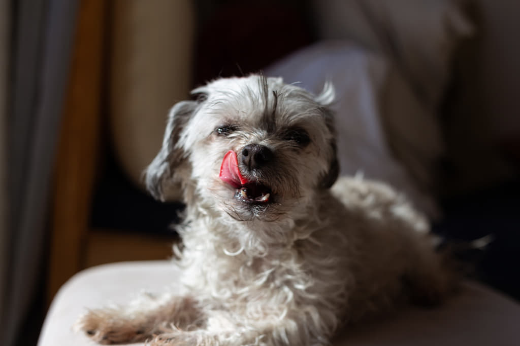 犬が鼻を舐める理由として、「口周りの汚れや食べ物の味を確認」することもあります。食事やおやつを食べた後、犬は口周りに付いた食べ物のかけらやにおいを舐め取ろうとします。