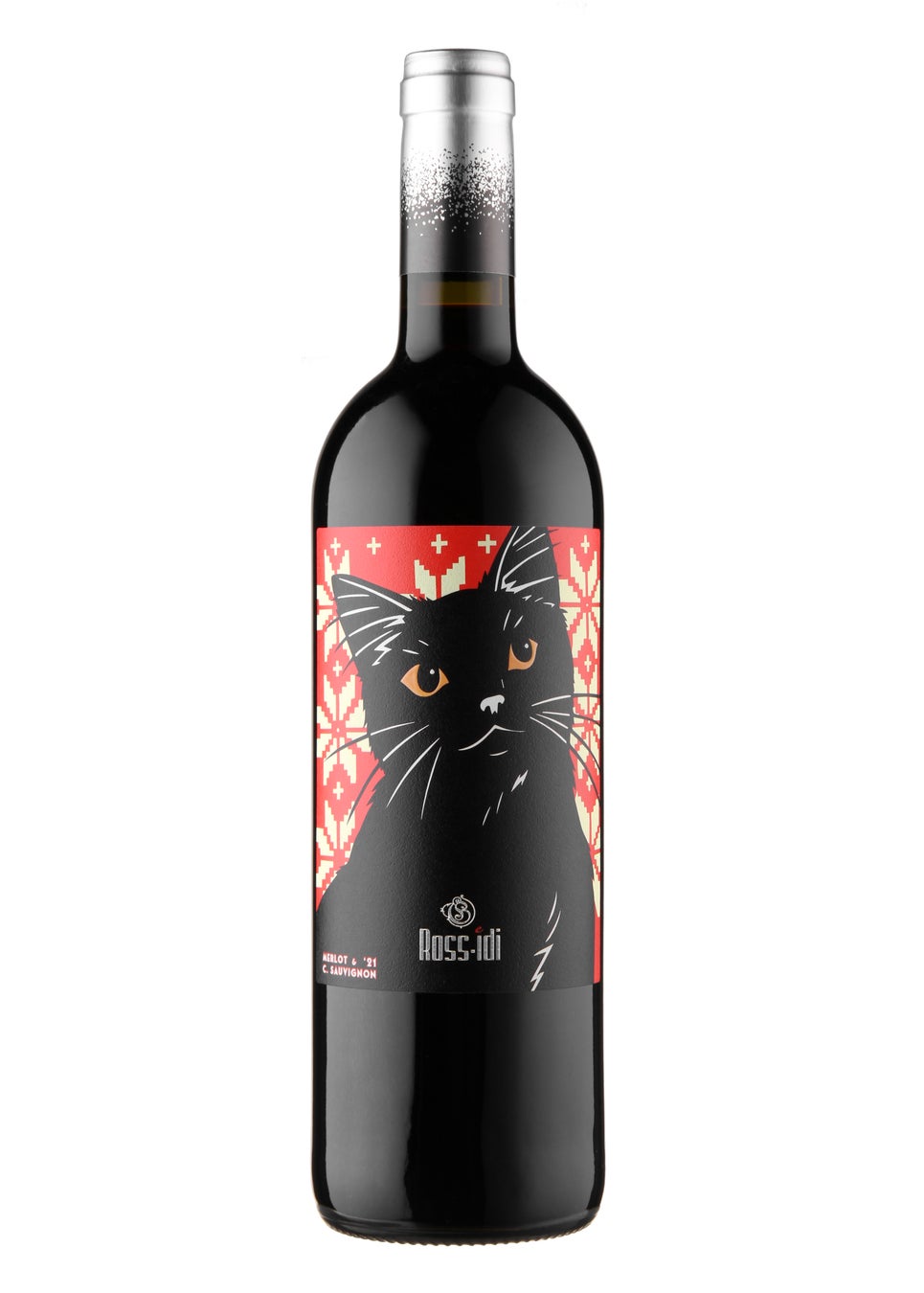 ■黒猫切絵ラベルのワインにはレッドチェリーやプラム、ブラックカラントなどのフレッシュなアロマとチョコレートやバニラのフレーバー、ベルベットのような質感の赤(メルローとカベルネソーヴィニヨンのブレンドワイン)。